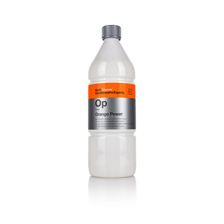 Koch Chemie Orange Power (OP) is a high-strength citrus-based cleaner developed for removing the toughest residues that normal cleaners canβt handle. Its powerful natural orange extracts dissolve adhesives, tar, gum, ink, oil, and grease safely and effectively.