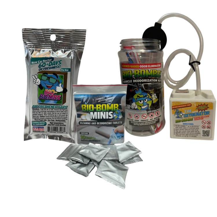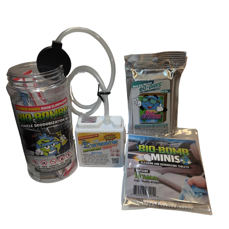 1× 10-Pack Bio-Bomb Minis – Mix with water for sprays, steamers, or extractors to target embedded odors in seats, carpets, and vents.