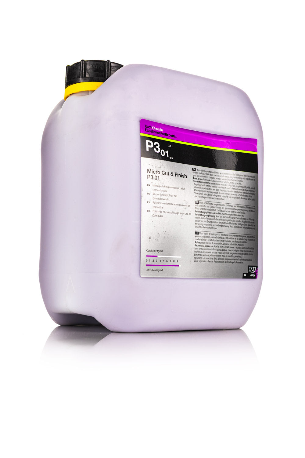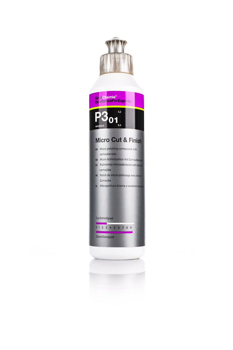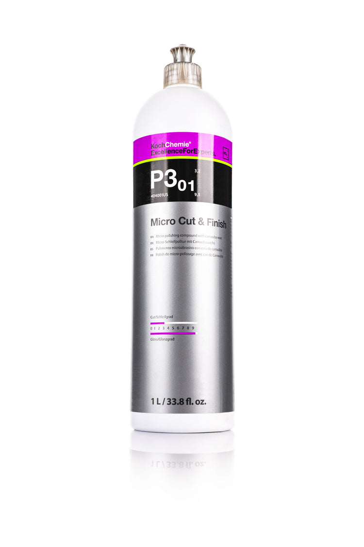 Koch Chemie Micro Cut & Finish P3.01 is a high-gloss micro-polish with built-in protection, designed to remove holograms, fine scratches, and swirl marks while leaving behind a durable carnauba wax finish. It’s the perfect finishing step after compounding or medium polishing, delivering a deep gloss and long-lasting protection in a single product.