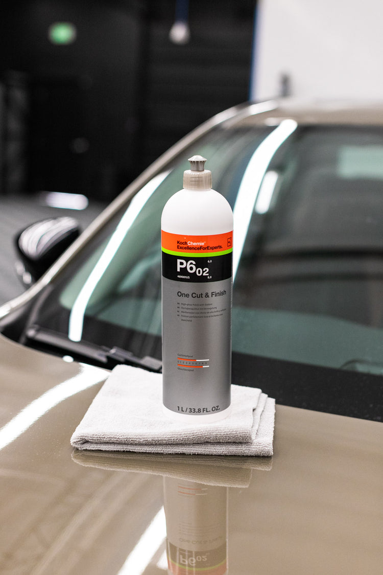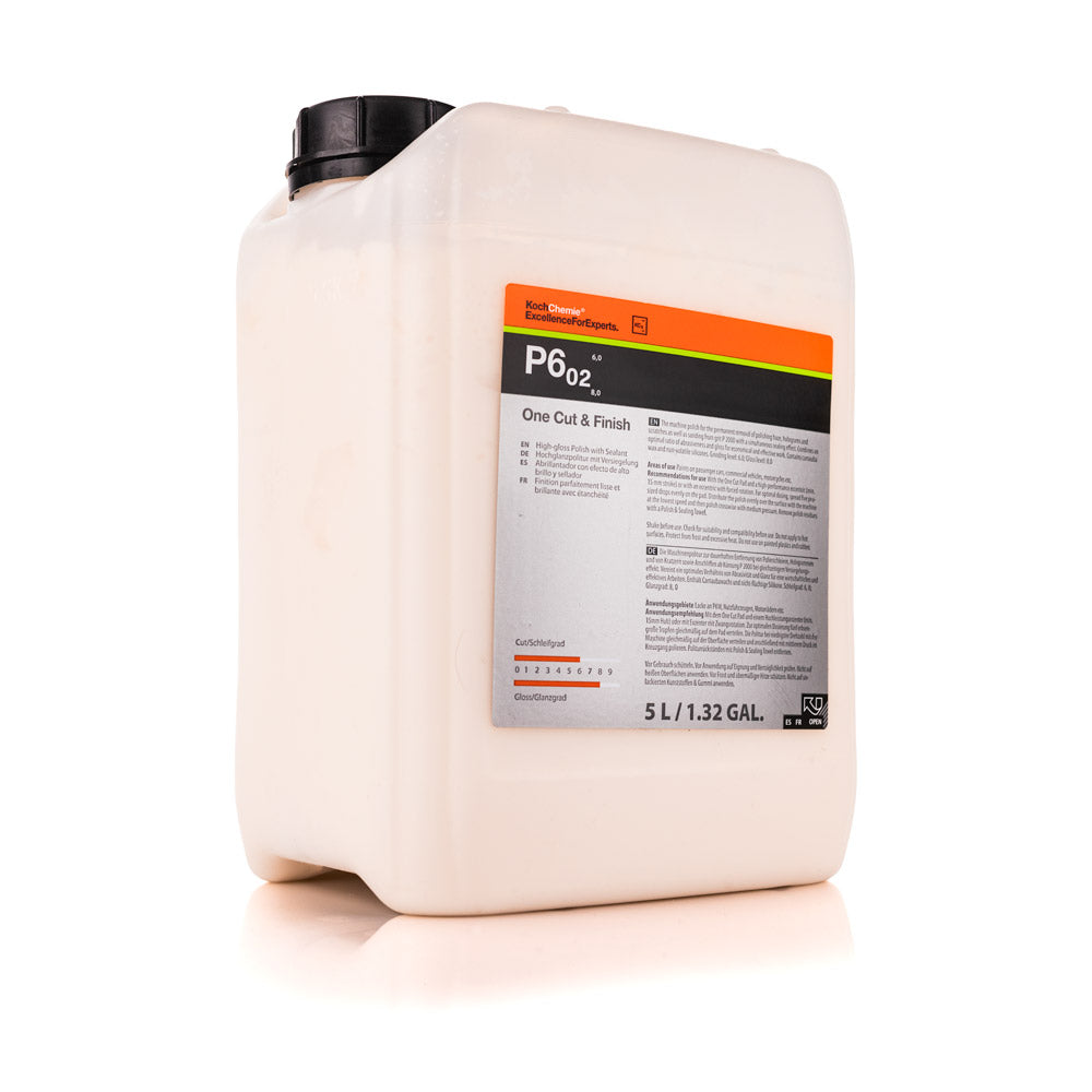 Koch Chemie One Cut & Finish P6.02 is a versatile one-step polish that combines cutting power, high-gloss finishing, and durable protection in a single process. Developed with advanced abrasive technology, it removes moderate defects like swirls and light scratches while leaving behind a deep gloss and a protective layer of carnauba wax.