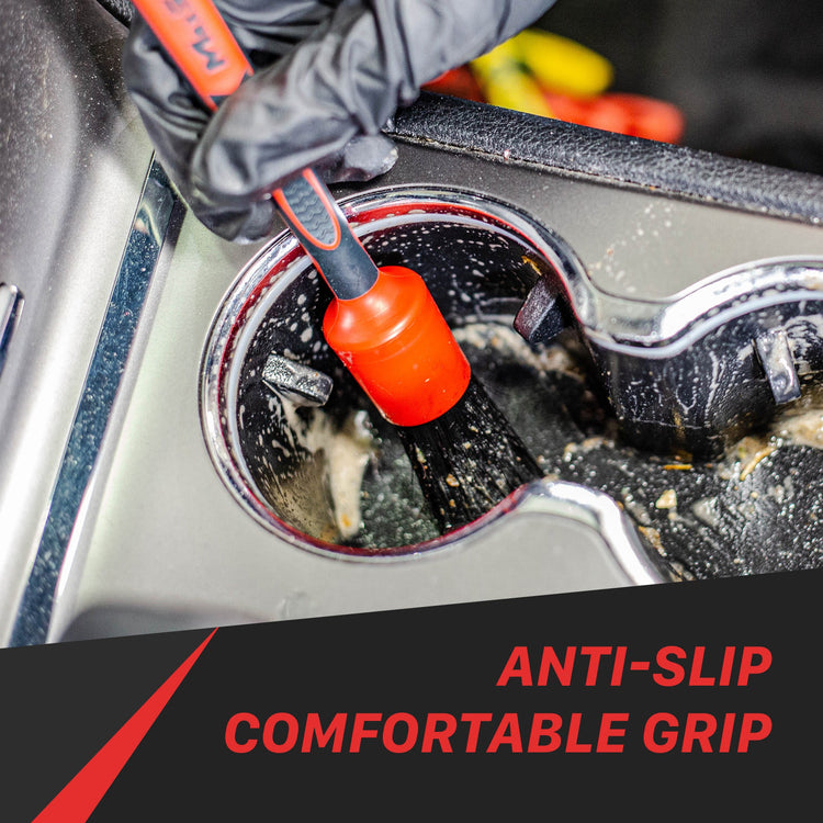 The detailing brush set, made of soft and high-density PET bristles, works well on any car surface, especially in tight and shaped areas. It provides quick recovery from brushing action, and an ergonomic non-slip handle collectively helps clean sharp angles and narrow openings, an ideal choice for detailing engine bay areas.