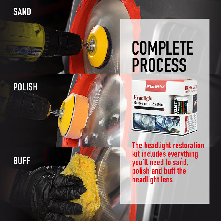 Headlight Restoration Kit is a comprehensive solution designed to quickly and safely restore clarity to faded and yellowed plastic and acrylic headlights. Utilizing a professional-grade cutting compound and polishing system, this kit effectively removes oxidation, stains, and minor scratches, leaving behind a protective layer that maintains a crystal-clear finish for up to a year. This all-in-one kit includes various sanding pads, a drill backing pad, polishing foam, cutting compound, finishing polish, and a microfiber towel, providing everything needed for a professional-level headlight restoration.