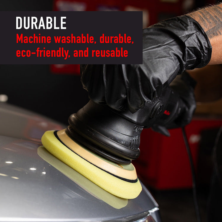 The foam cutting pads are essential for cutting, polishing, and finishing car detailing with 5" or 6" sizes, removing the toughest oxidation and scratch with flexible, washable, and reusable material construction. The adhesive backing allows quick and effortless pad changes in just a second.