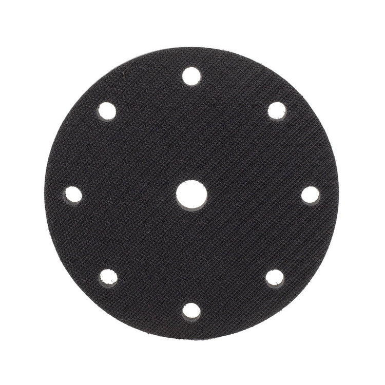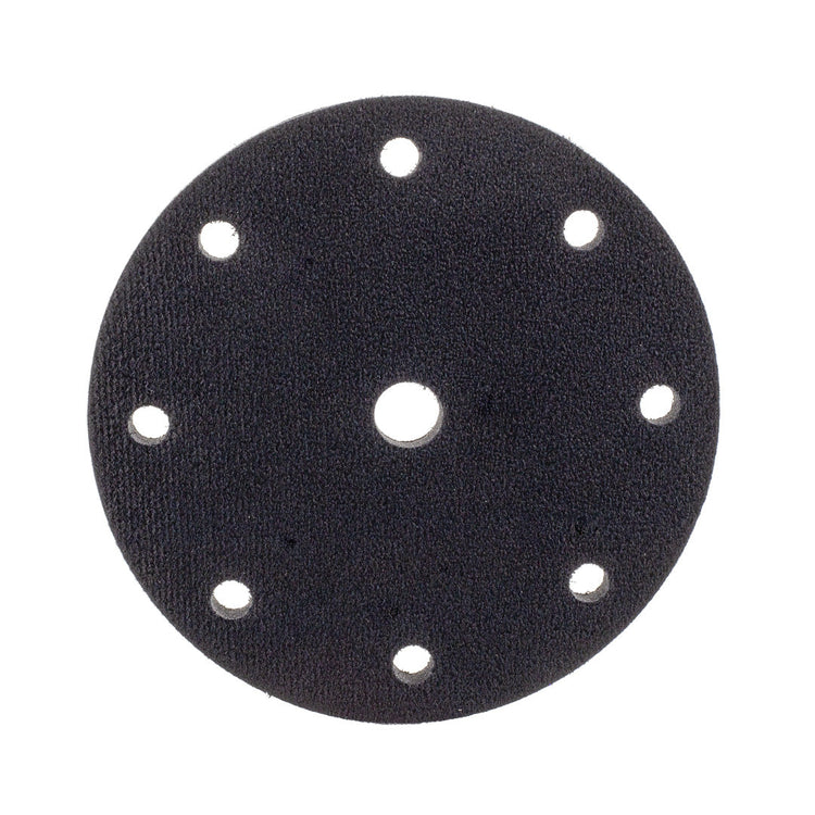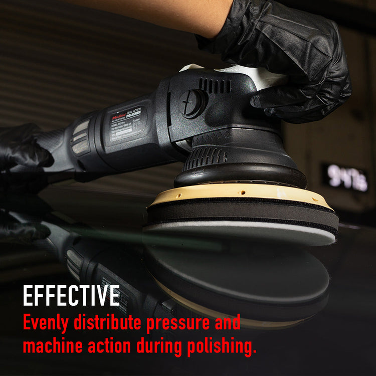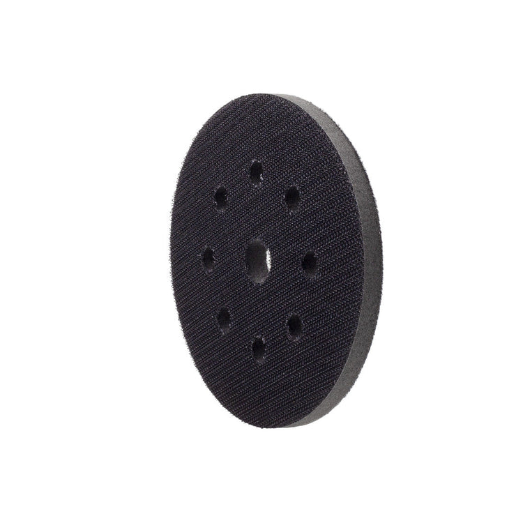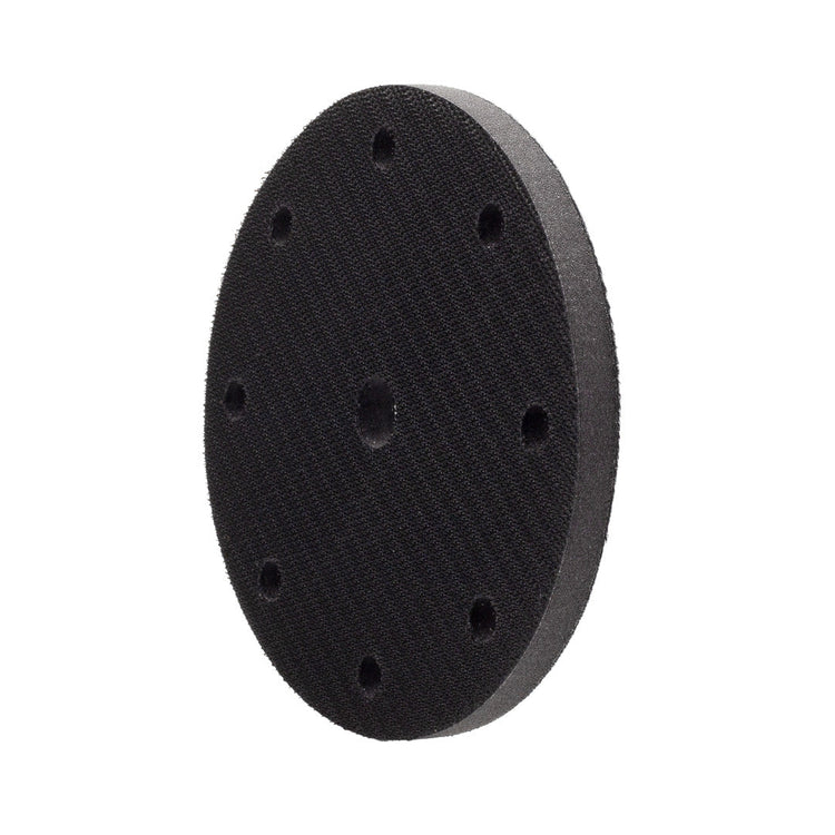 The soft interface foam pad is unique among polishing foam pads since it works as a backing pad for sandpaper. The sandpaper is too thin to attach to a polisher backing plate, and there is no way of providing a cushion between the surface and a polisher. This soft foam interface pad embraces a soft foam layer, helping even pressure distribution while reducing heat and seamless contouring with sandpaper. The center cut with eight(8) vacuum holes helps to reduce the heat and absorb dust during polishing for final sanding prep. The unique features of the soft foam interface pads allow the interface of the final stage of the fine sanding process.