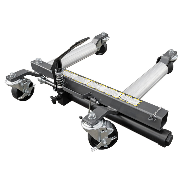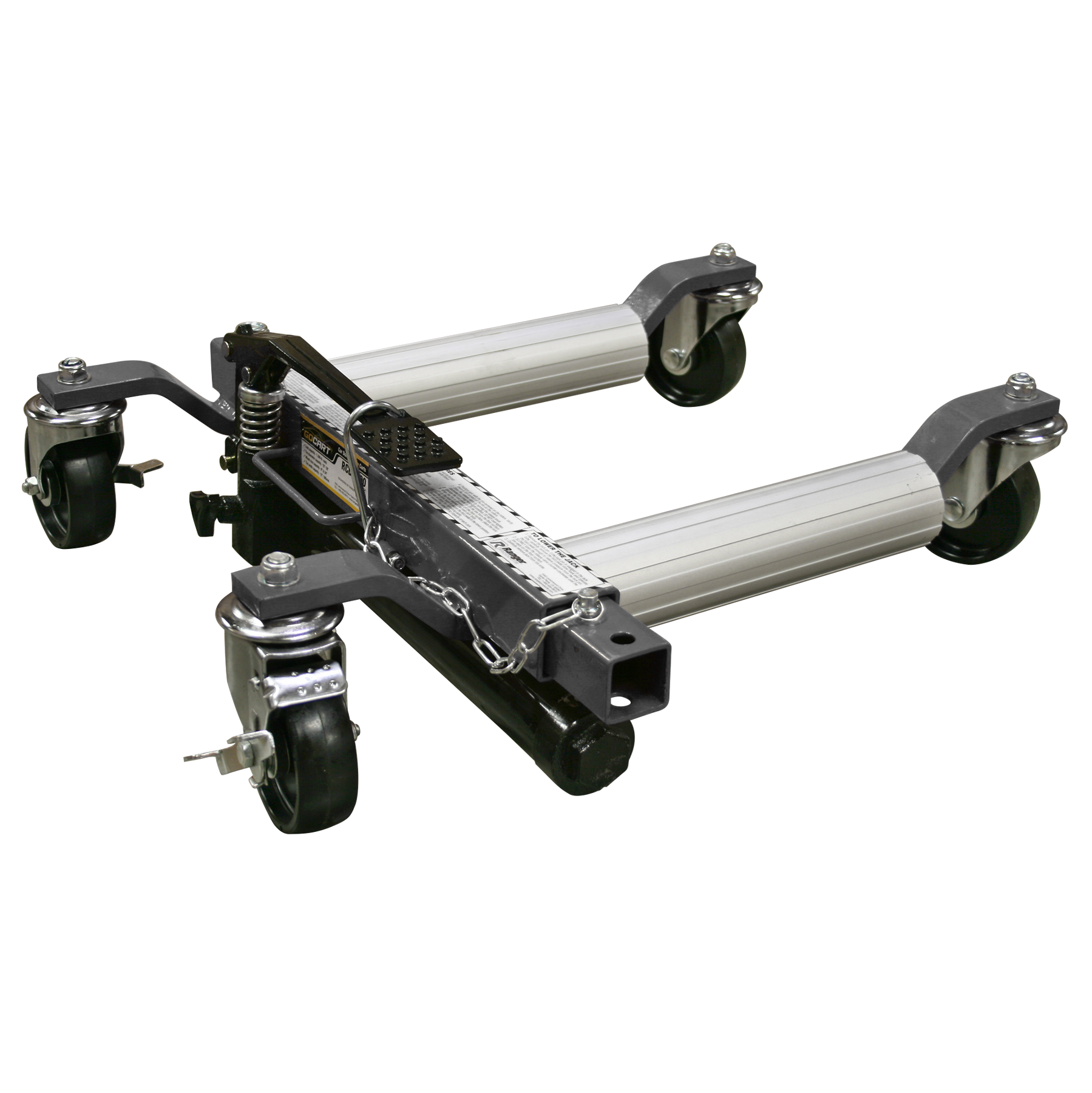 These heavy-duty car dollies feature a quick-action hydraulic foot pump to lift any car or light truck in seconds, providing instant mobility in any direction. A multi-position locking pin secures the load after the unit is raised to the required height. Reinforced, non-skid brushed aluminum rollers ensure a solid and stable tire support, and a low center of gravity makes them safe and stable during use.