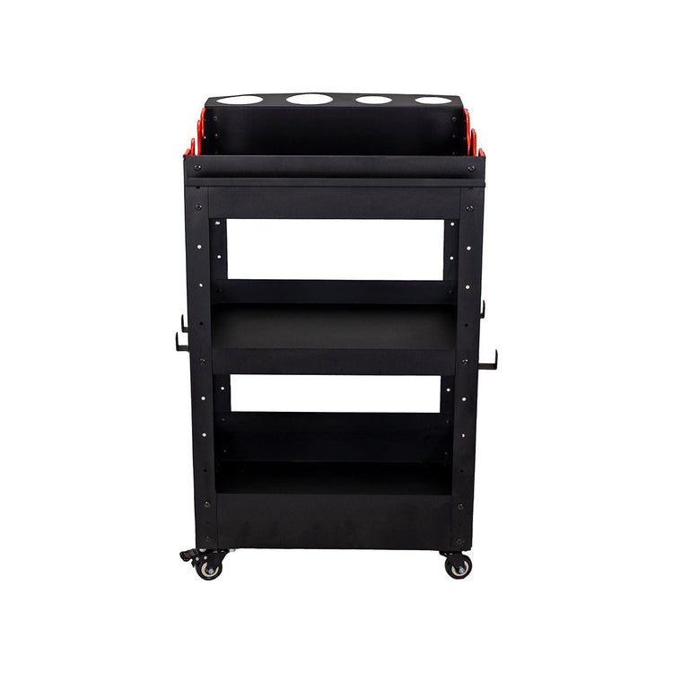 This sturdy steel detailing cart boasts durability and ample storage space for all your car care needs. Three recessed tiers and dedicated slots hold various tools, from polishers and brushes to chemical bottles and towels. Navigate with ease thanks to durable wheels and casters, including two brakes for secure positioning. Whether you're washing, claying, polishing, or waxing, this cart keeps your tools organized and readily accessible, making detailing a breeze.
